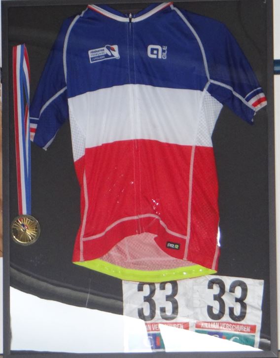 Le maillot, la médaille et le dossard du champion qui a débuté le cyclisme à l ‘école de vélo de l’ACQ en 2015, il a passé 5 ans au club.